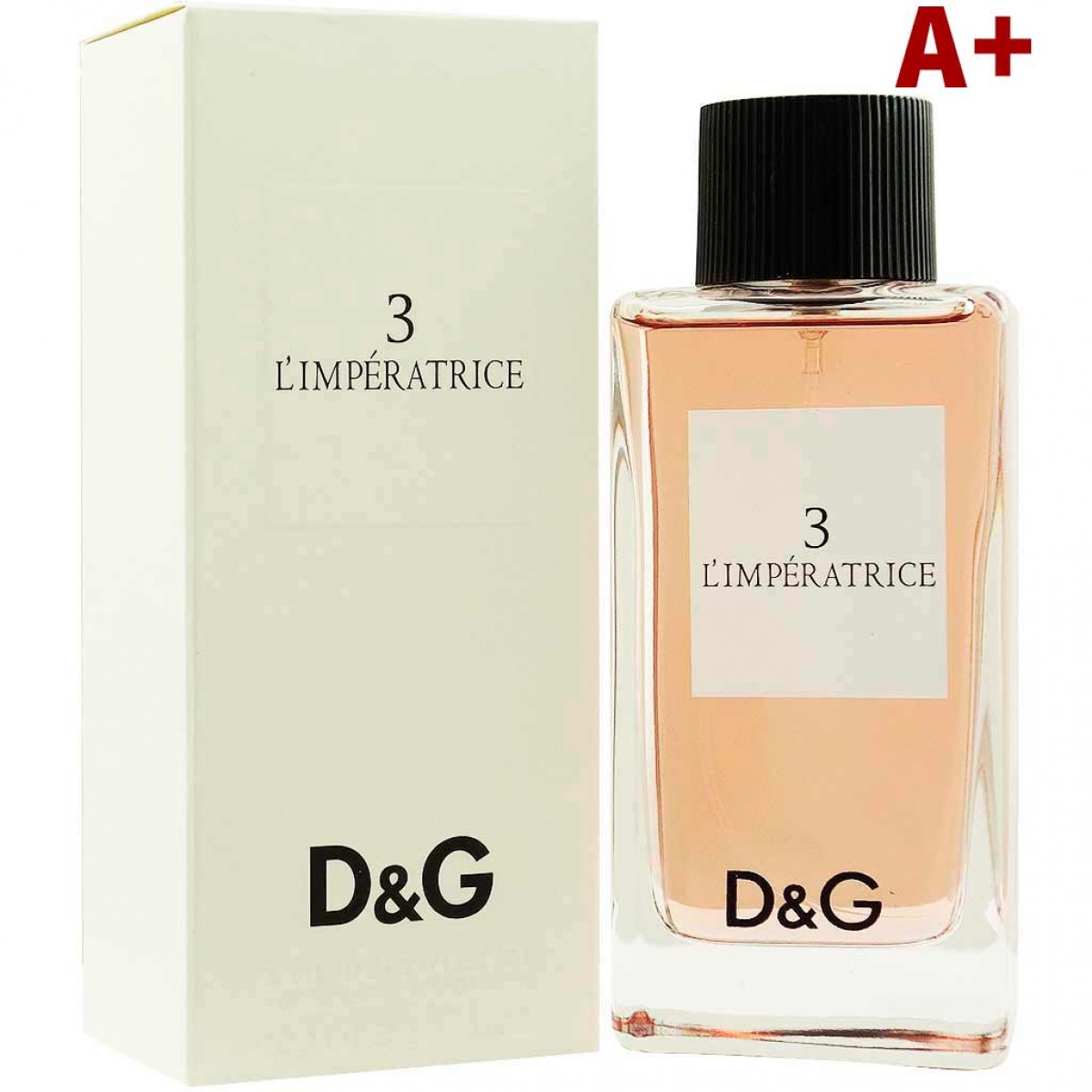 A + Dolce & Gabanna 3 L`imperatrice – изысканный и роскошный парфюм для настоящих леди. Начало его филигранной сюиты звучит тонами дерзкого киви, ревеня и розового перца. Средние акценты изобилуют красками сочного арбуза, нежного жасмина и цикламена. База соткана из триады мускуса, лимона и сандала.