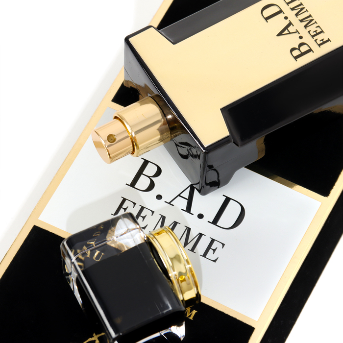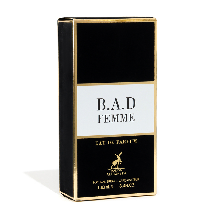Этот аромат, - воплощение захватывающих сочетаний, которые пленяют своей неординарностью и контрастностью. Его композиция открывается резкими аккордами кофе с миндалём. Независимый и сильный запах, характеризующий таких же девушек. Далее он перетекает в хрупкие и нежные ароматы жасмина, с подчёркнутым благоуханием туберозы. Но эта мнимая слабость скоро разрушается завершающими дерзкими аккордами духов B.A.D. FEMME. Насыщенный запах какао и бобов тонка снова напоминает о внутренней силе натуры, которая источает эти притягательные и сексапильный флюиды.