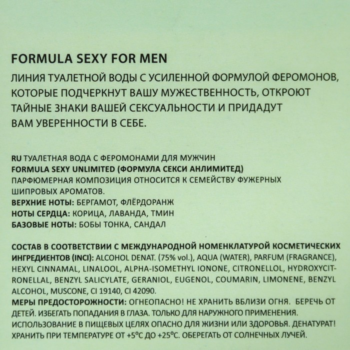 Туалетная вода мужская с феромонами Formula Sexy Unlimited, 100 мл (по мотивам Семейство шипровых ароматов)