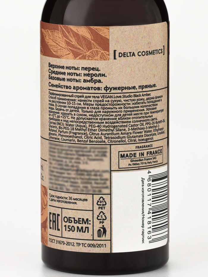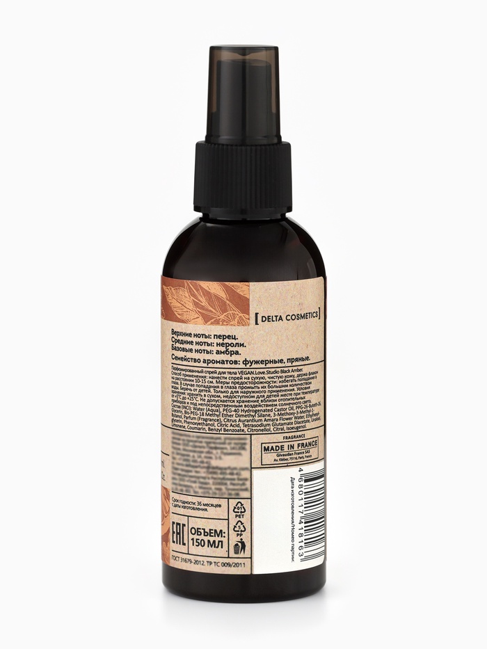 Парфюмированный спрей-мист для тела VEGAN.Love.Studio «Black Amber», 150 мл — это утончённое воплощение элегантности и стойкого аромата, вдохновлённое композицией Black Pepper & Amber, Neroli от Zielinski & Rozen.
