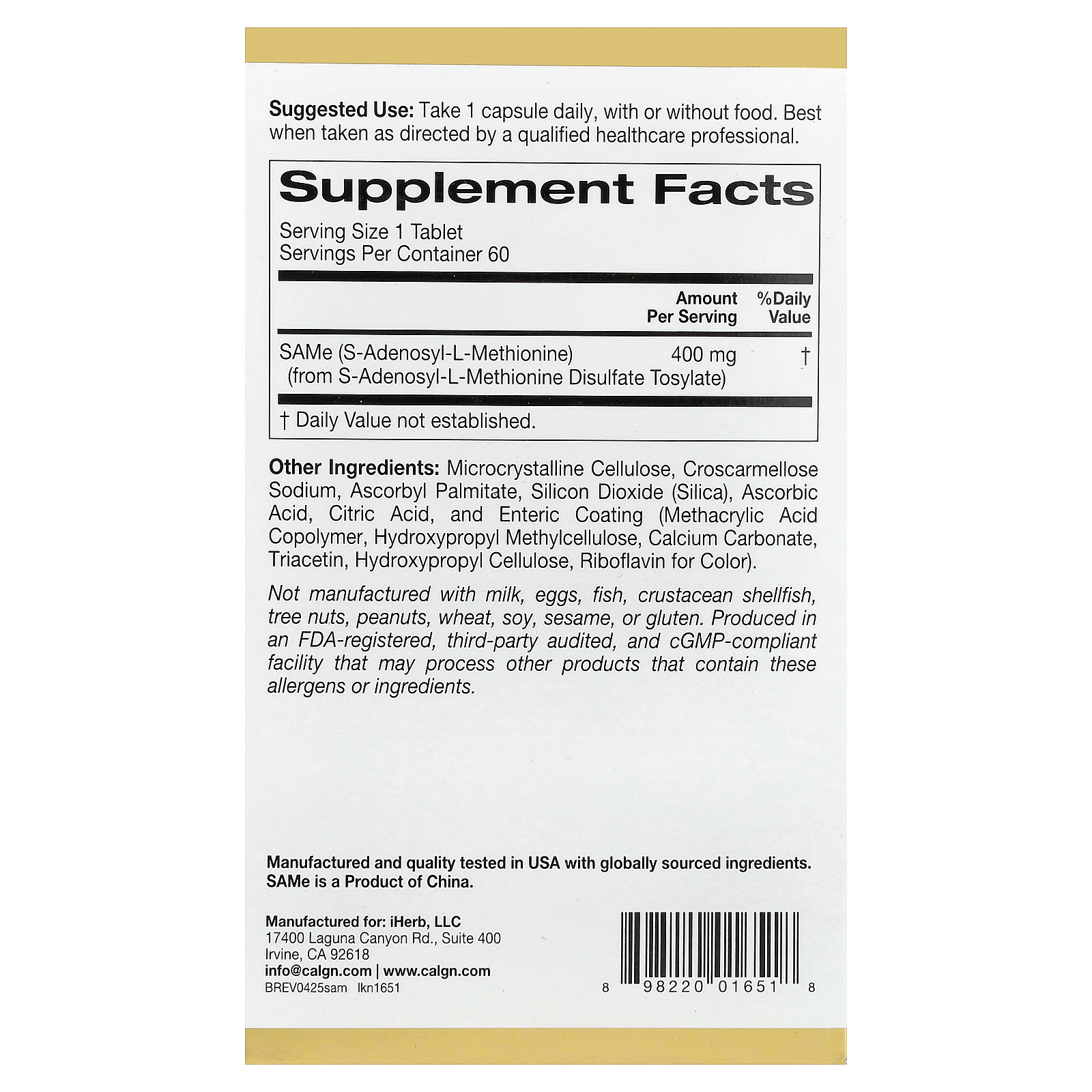 California Gold Nutrition® SAMe доставляет важное соединение, известное как S-аденозил L-метионин, непосредственно в организм. Это соединение необходимо для нормального функционирования организма и может поддерживать здоровье суставов, печени, а также хорошее настроение*.