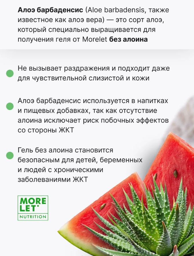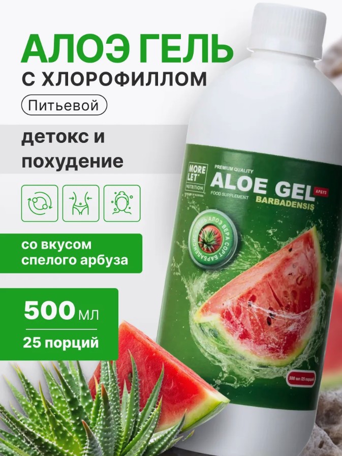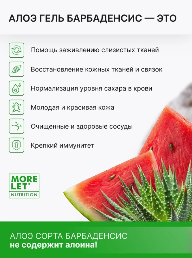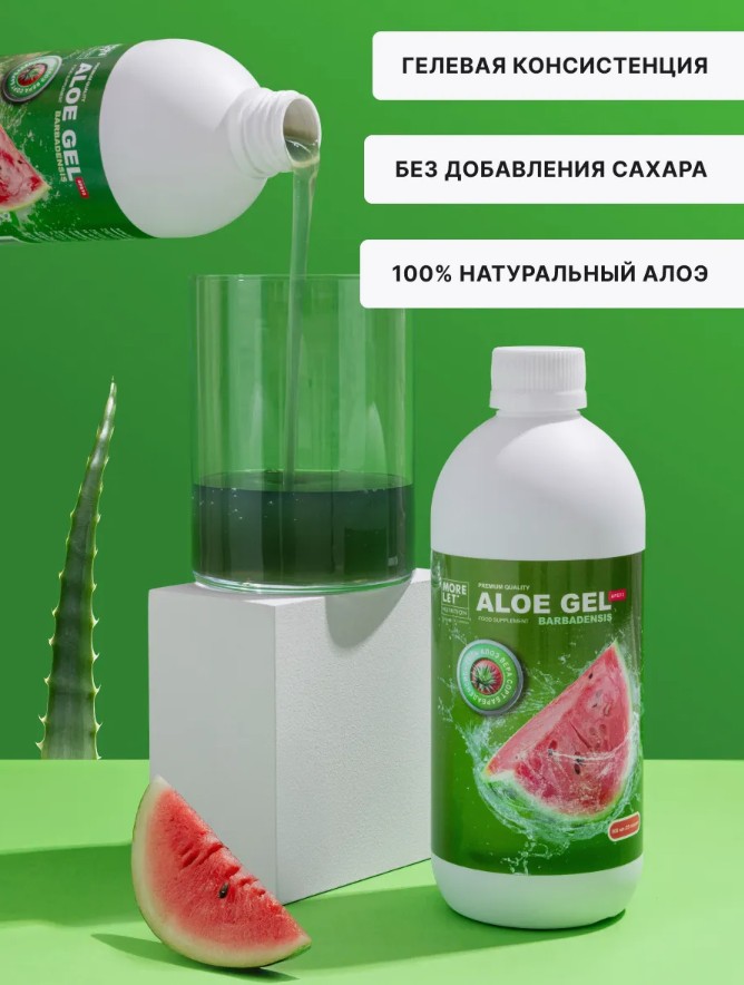 Гель Алоэ Вера сорта Барбаденсис (без алоина), медный комплекс хлорофиллина натрия, вода очищенная структурированная, натуральный сок арбуза, лимонная кислота, ксантановая камедь, стевиолгликозид (подсластитель), экстракт мяты, натуральный консервант AiBi.