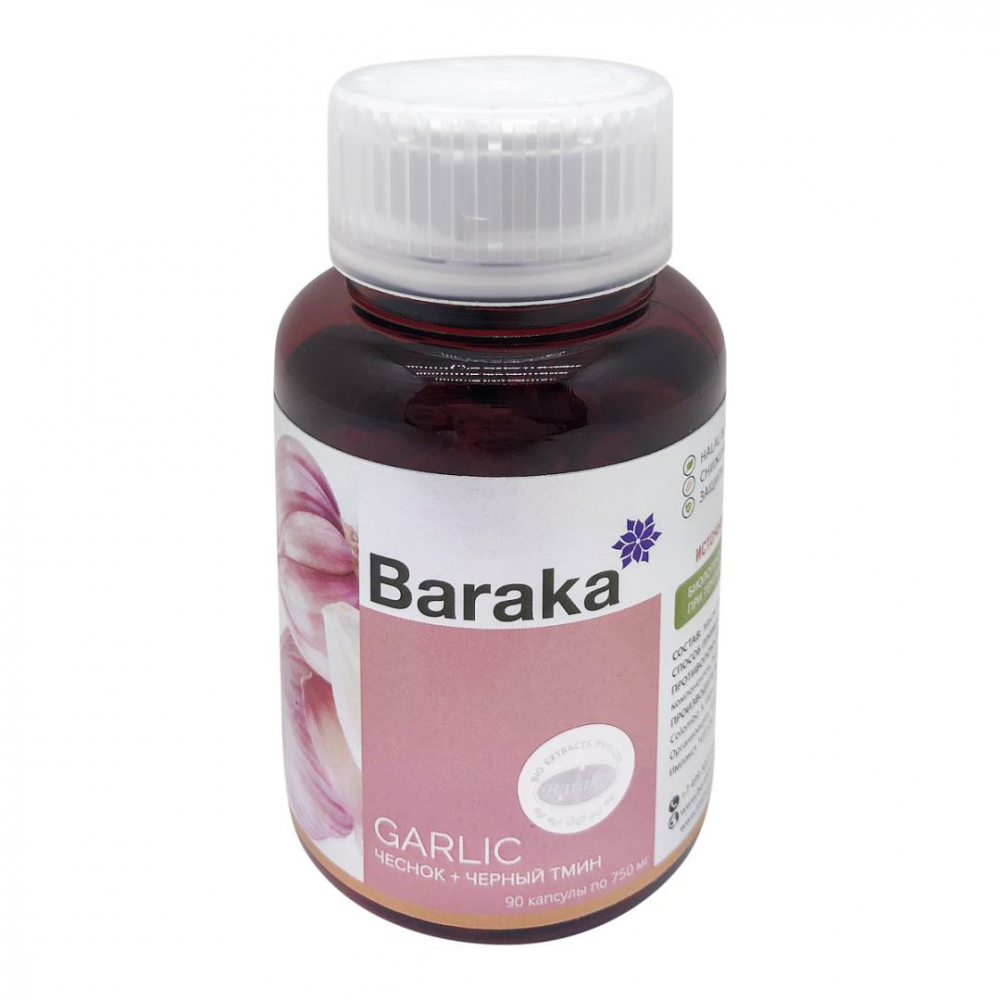 В капсулах «Гарликол» от компании Baraka черный тмин сочетается с маслом чеснока – одним из самых дорогостоящих растительных масел. Его высокая себестоимость объясняется следующим: для того чтобы получить всего лишь 1 г этого масла необходимо использовать 500 г чеснока. Именно поэтому его смешивают с другими растительными маслами. Оптимальным вариантом при этом считается использование масла черного тмина, поскольку именно черный тмин в капсулах во много раз усиливает действие чесночного масла, является очень полезным сам по себе и обладает восстанавливающими и целебными свойствами.