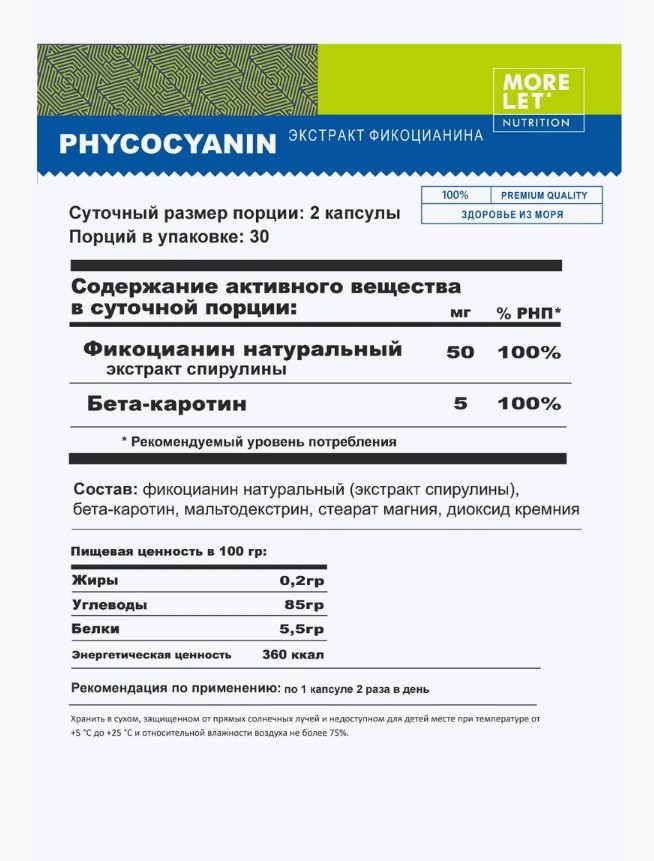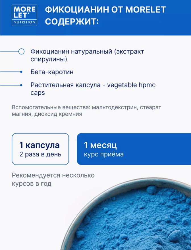 Фикоцианин натуральный (экстракт спирулины), бетакаротин, мальтодекстрин, стеарат магния, диоксид кремния.