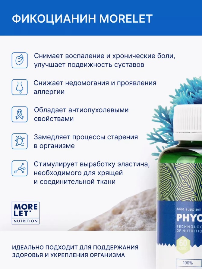 Фикоцианин — это белок растительного происхождения синего цвета, содержащийся в морских водорослях. Безопасность, эффективность и широкий спектр действия относят его к категории добавок, которые можно применять при любых диагнозах для ускорения лечения и общего укрепления здоровья.