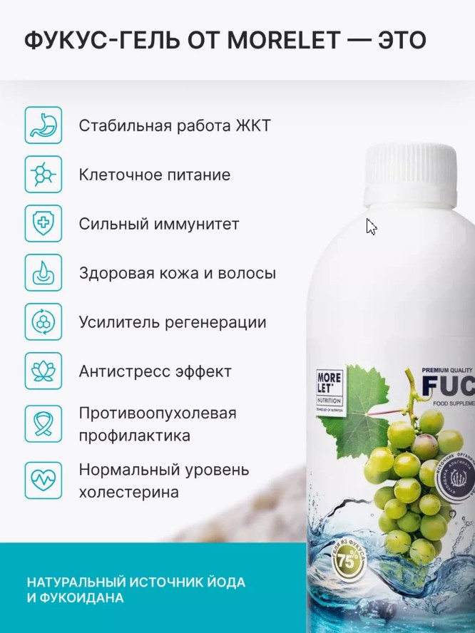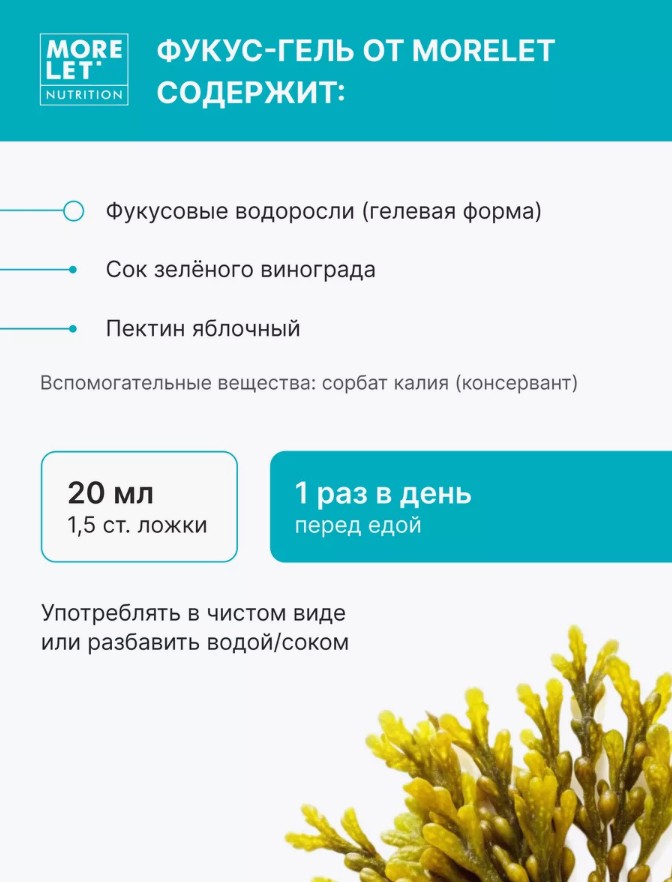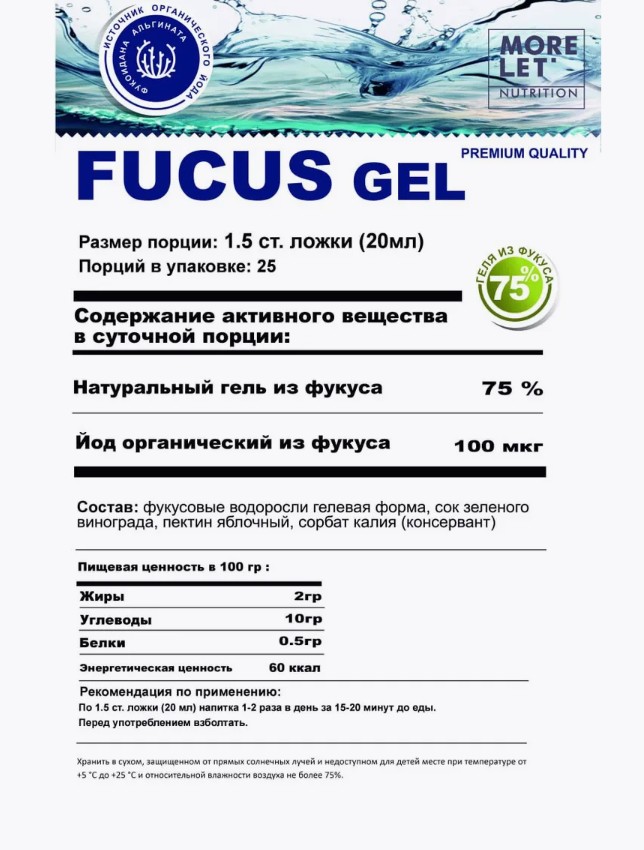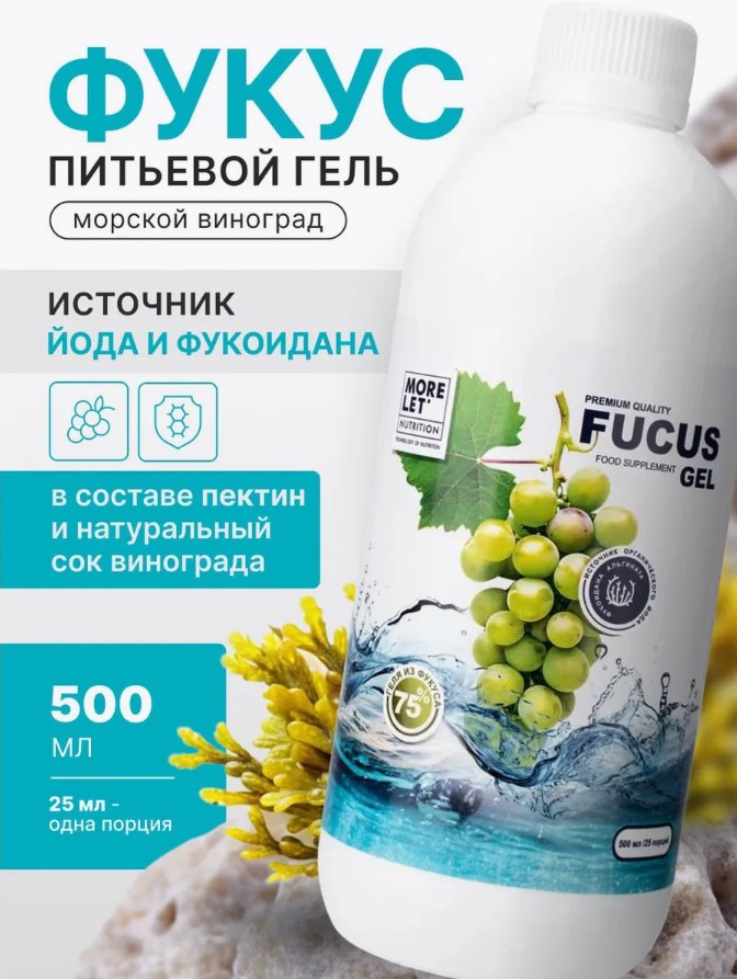 Фукус гель — водоросль, чрезвычайно богатая уникальными нутриентами для здоровья. Используется как мощный адаптоген (общеукрепляющее), который чистит организм и питает его витаминами, аминокислотами и многими морскими компонентами.