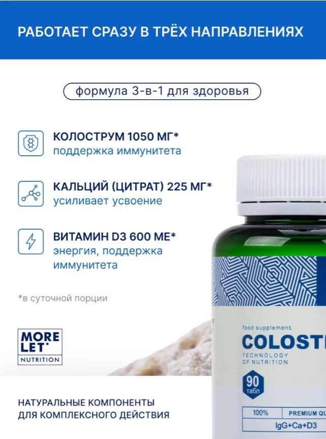 Колострум является отличным дополнением к вашему рациону, особенно в сочетании с витамином Д3, который способствует оптимальному функционированию всех систем организма. Добавка подходит как для взрослых, так и для подростков, что делает её универсальным решением для всей семьи.