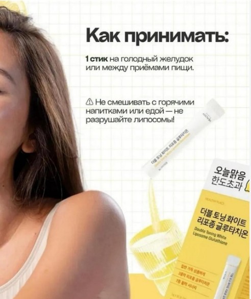 HEALTHY PLACE Глутатион – секрет безупречной кожи из Кореи. Липосомная формула Double Toning White действует изнутри: мощный антиоксидант очищает организм от токсинов, уменьшает пигментацию, осветляет и выравнивает тон кожи. Уже через несколько недель кожа выглядит более сияющей, упругой и здоровой. Удобный формат в саше позволяет принимать глутатион в любом месте и в любое время.