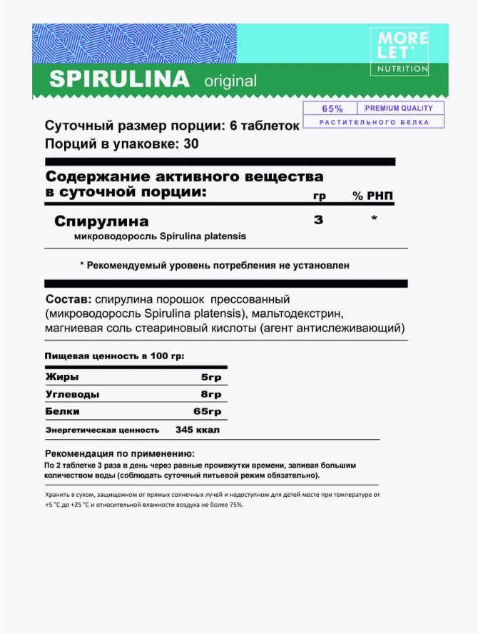 Принимать биодобавку необходимо в течение 1 месяца по 6 таблеток в день. Содержание в 1 дозе активных веществ: спирулина (микроводоросль Spirulina platensis) — 500 мг.
