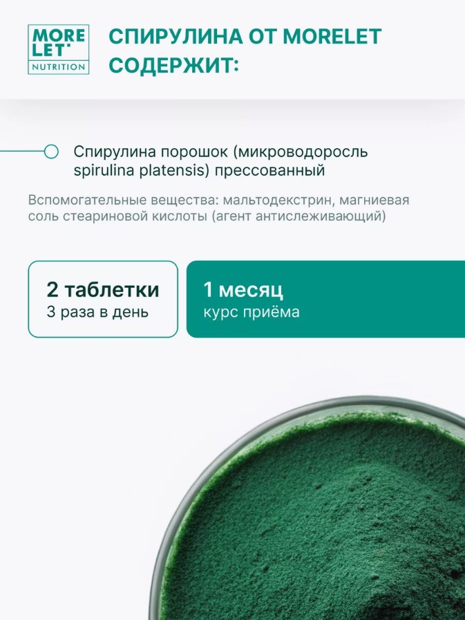 Основной компонент препарата – порошок спирулины (микроводоросль Spirulina Platensis) прессованный. Вспомогательные вещества: мальтодексин и магниевая соль стеариновой кислоты.