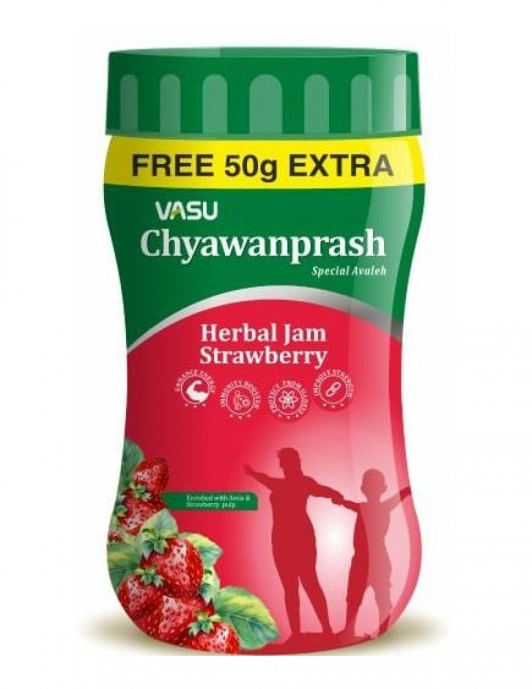 Чаванпраш Клубника – это джем для укрепления и восстановления иммунитета, энергии и профилактики заболеваний. В его составе – травы, ягоды, фрукты. В джем добавлена клубника, которая обеспечивает антиоксидантную защиту, замедляет старение, поддерживает здоровье сердца, улучшает зрение и пищеварение. Насыщает организм витаминами и минералами, улучшает настроение. Чаванпраш улучшает состояние кожи и волос, укрепляет кости, ногти, хрящи, зубы. Для любого возраста. Способ применения: употреблять до еды, по 1 ч. л./день утром и вечером. Дозировка для пожилых людей 1/3 ч.л., для детей – ¼ ч. л. Запивать любым напитком, лучше – теплым молоком, или в нем сразу размешать джем. Курс – 108 дней с интервалом в месяц.