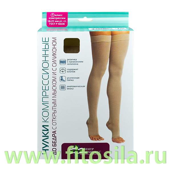 Чулки компрессионные до бедра с открытым мыском с силиконом (Нанесение капельное ) (I класс компрессии, Типоразмер № 3) ПАРА. Цвет - кремовый. Артикул - ЧСк1(п)-К