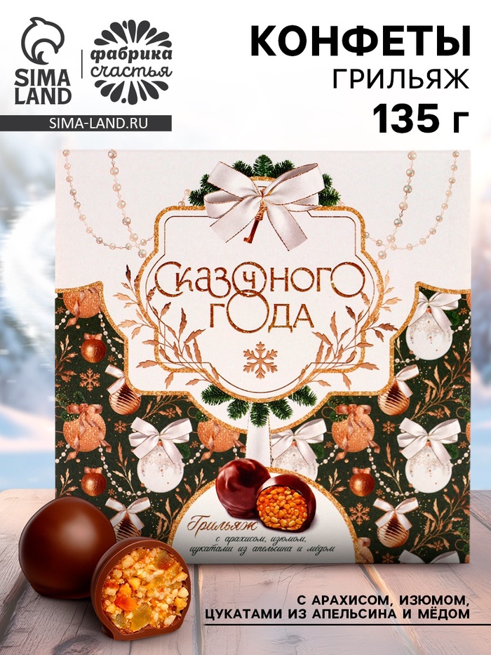 Состав: шоколадная глазурь (сахар, какао тёртое, эквивалент масла какао, какао-порошок, лецитин соевый (натуральный эмульгатор), натуральный ароматизатор – ванилин), арахис жареный дроблёный, изюм, цукаты апельсина, мёд натуральный, экстракт розмарина. Продукт может содержать следы яичного белка, молочного белка, фундука, миндаля, грецкого и кедрового орехов, кунжута.