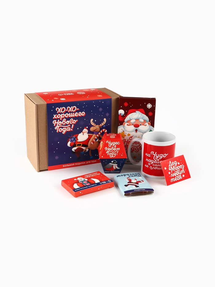 Составляющие набора: Кружка, Шоколад, Конфеты, Печенье, Жевательная резинка