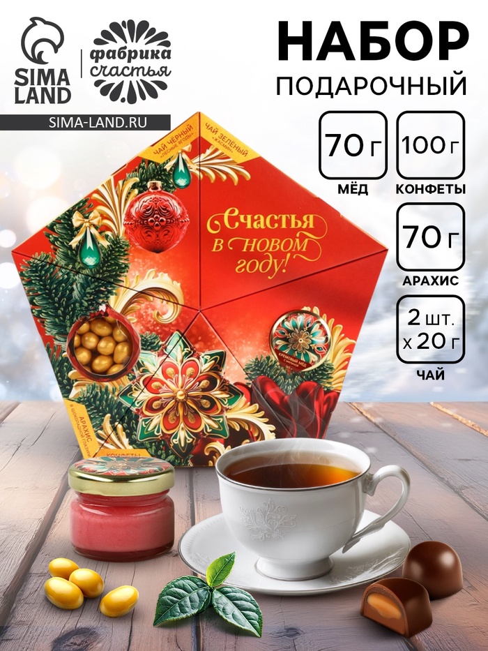 Составляющие набора: Чай, Конфеты, Крем-мёд, Арахис