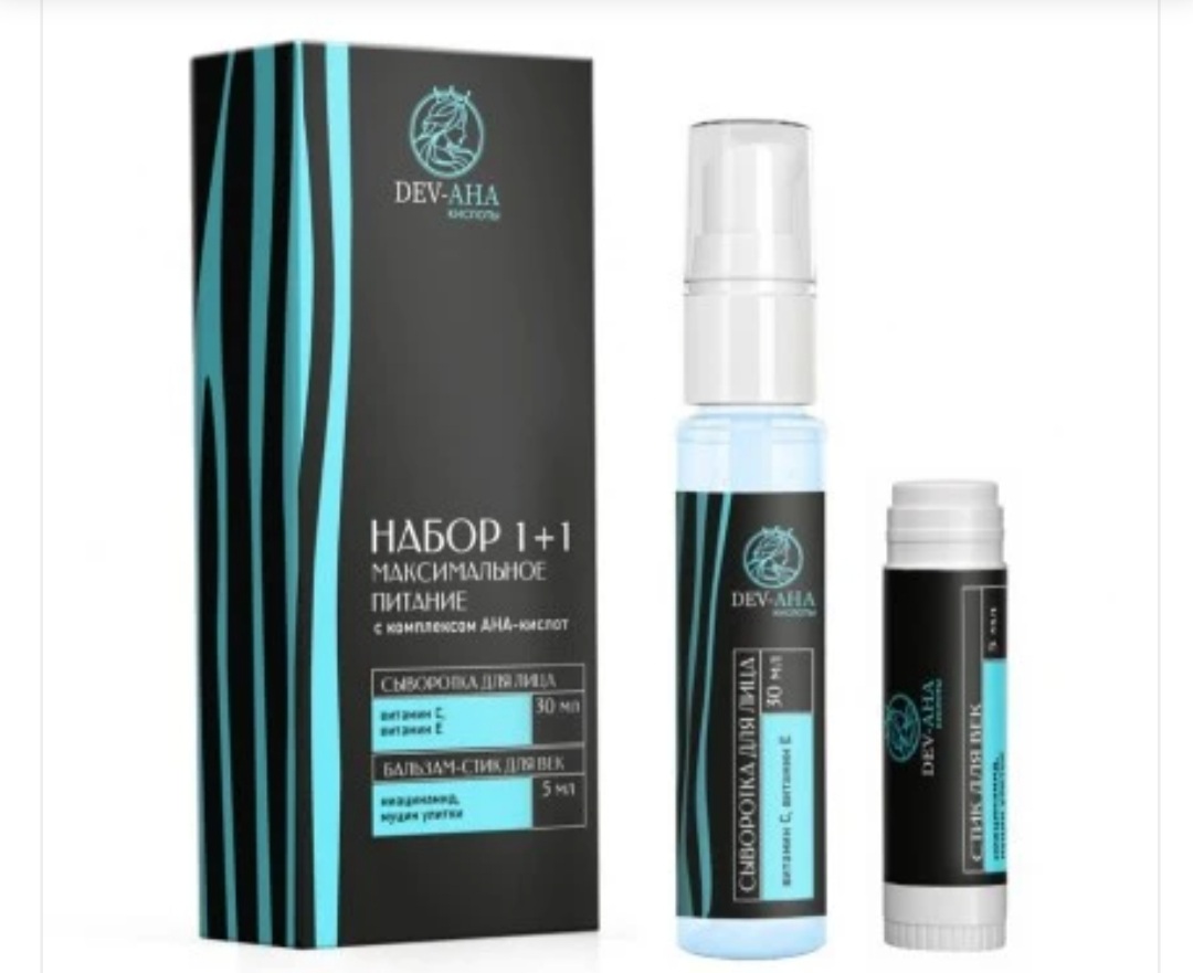 Набор «Максимальное питание» DEV-AHA — интенсивный уход для кожи, нуждающейся в глубоком питании, восстановлениии защите. Сыворотка для лица с комплексом АНА-кислот— это питаниеи антиоксидантная защита, придающая вашей коже здоровое сияние и свежестьуже с первых применений. Формула сыворотки разработана для глубокого восстановления и насыщения кожи. Миндальная кислота, яблочная кислота активно стимулируют обновление кожи, помогая ей выглядеть молодой и сияющей. Витамин С и витамин Е — мощные антиоксиданты, которые осветляют, выравнивают тон и защищаютот преждевременного старения. Настои ромашки, календулы, шиповника, розы, чаги и экстракт арганы успокаиваюти питают кожу, делая её мягкой и гладкой;