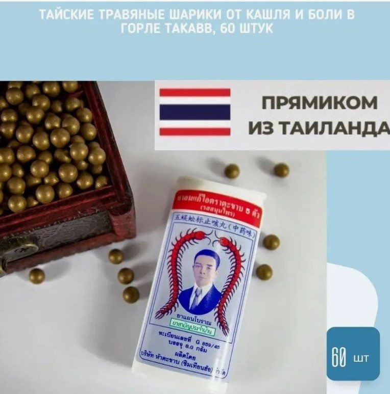 Травяные таблетки тайского производителя бренда Takabb (Такаб), выпускающего серию лечебных средств в Таиланде более 80 лет. Травяные тайские драже со сколопендрой, принимают при кашле – способствуют разжижению и удалению мокроты. Также травяные драже можно принимать для освежения дыхания.