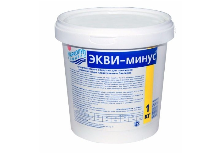 ЭКВИ-минус - порошкообразное средство для понижения уровня рН воды плавательного бассейна. Своевременное использование препарата позволяет избежать образования известкового налёта на облицовочной плитке._x000D__x000D_Состав: натрия гидросульфат; содержание основного вещества - 85%._x000D__x000D_Рекомендации по использованию ЭКВИ-минус:_x000D__x000D_1) Необходимо 2-3 раза в неделю проводить контрольные замеры рН-тестером и корректировать состав воды. 2) Оптимальный уровень рН воды бассейна должен соответствовать 7,0-7,4. 3) Если значение рН превышает 7,6, то оно должно быть понижено до уровня 7,2 с помощью средства Экви-минус. 4) Препарат следует добавлять порциями непосредственно в воду бассейна вблизи места подачи или в нескольких местах одновременно (но только не перед фильтрами)._x000D__x000D_Дозировка:_x000D__x000D_1) Для снижения значения рН на 0,1 необходимо добавить 140 г средства на 10 м3 воды. 2) При жёсткой воде и интенсивном использование бассейна следует увеличить дозы и частоту добавок. 3) При использовании средства необходим технический перерыв в работе бассейна не менее 3 часов._x000D__x000D_Меры безопасности и условия хранения:_x000D__x000D_ _x000D__x000D_Хранить в недоступном для детей месте. Избегать контакта с глазами и кожей. Не употреблять внутрь. Не смешивать с другими химикатами. _x000D__x000D_Хранить в прохладном месте. _x000D__x000D_Хранить в герметичной оригинальной упаковке. _x000D__x000D_Беречь от влаги. _x000D__x000D_Хранить вдали от щелочей и хлорсодержащих препаратов _x000D__x000D__x000D__x000D_Перед использованием продукта необходимо ознакомиться с инструкцией и указаниями по безопасности.