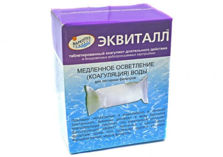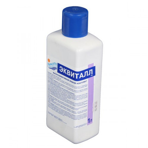 Описание_x000D__x000D_Жидкий препарат «Эквиталл» поставляется во флаконах 1 литр (1.2 килограмма) и представляет собой коагулянт (средство для устранения помутнения) для воды бассейнов. «Эквиталл» во флаконах 1 л. применяют, для ручного дозирования для маленьких бассейнов. Препарат значительно улучшает эффект работы песчаных фильтров._x000D__x000D_Обычные песчаные фильтры для бассейна не способны улавливать мельчайшие частички грязи, размер которых составляет всего лишь сотые доли микрона. Но наличие множества таких частиц легко определяется по помутнению воды. Действие коагулянтов, а в частности, препарата Маркопул «Эквиталл» основано на связывании мельчайших частиц (до 0,07 мкм), в крупные хлопья, которые способен задержать фильтр._x000D__x000D_Преимущества_x000D__x000D_ _x000D__x000D_Быстрое действие, подходит для ударного применения; _x000D__x000D_Эффективность при любой температуре; _x000D__x000D_Возможность непрерывного использования в станциях автодозации; _x000D__x000D_Безопасность для человека (основной действующий компонент используют также для очистки питьевой воды). _x000D__x000D__x000D__x000D_Рекомендации по использованию_x000D__x000D_Перед применением препарата следует произвести обратную промывку фильтра._x000D__x000D_Проконтролируйте, чтобы уровень pH воды бассейна находился в пределах 7.0-7.4, при необходимости, отрегулируйте его с помощью средств Экви-минус или Экви-плюс. Также в контроле и регулировке нуждается уровень свободного хлора (0.3-0.5 мг/л) и уровень щёлочности (125-150 мг/л)._x000D__x000D_При ручном дозировании_x000D__x000D_ _x000D__x000D_Медленно и равномерно влейте необходимое количество препарата в скиммер при работающем насосе. _x000D__x000D_Через 10-15 минут после дозирования выключите насос и ожидайте накопления слоя хлопьев в течение 6-8 часов. _x000D__x000D_Удалите со дна накопленный слой хлопьев с помощью водного пылесоса, сливая воду с осадком в канализацию. _x000D__x000D_Для очистки оставшейся воды включите фильтрацию до тех пор, пока остатки хлопьев не будут устранены. _x000D__x000D_Сделайте обратную промывку фильтра. _x000D__x000D_Если помутнение воды устранено не полностью, повторите процедуру очистки. _x000D__x000D__x000D__x000D_Расход препарата_x000D__x000D_При текущей ручной обработке следует добавлять 135 мл. (165 гр.) препарата на 10 м3 воды 1-й раза в сутки (требуется перерыв не менее 3-х часов)._x000D__x000D_При ударной ручной обработке (при повышенном уровне мутности) следует добавлять 315 мл. (385 гр.) препарата на 10 м3 воды бассейна (с перерывом на 24 часа)._x000D__x000D_Рекомендации по безопасности_x000D__x000D_ _x000D__x000D_После работы с препаратом следует вымыть руки; _x000D__x000D_Хранить в местах, недоступных для детей; _x000D__x000D_При попадании концентрата на кожу в слизистые оболочки – обильно промыть водой; _x000D__x000D__x000D__x000D_Рекомендации по хранению_x000D__x000D_ _x000D__x000D_Препарат следует хранить закрытом проветриваемом помещении в плотно закрытой упаковке производителя, вдали от пищевых и питьевых продуктов. _x000D__x000D_Срок годности — 6 месяцев с даты изготовления (возможно использование препарата по истечении срока годности если не произошла самокоагуляция: выпадение белого осадка). _x000D__x000D__x000D__x000D_Состав_x000D__x000D_Полиоксихлорид алюминия (12 % по оксиду алюминия).