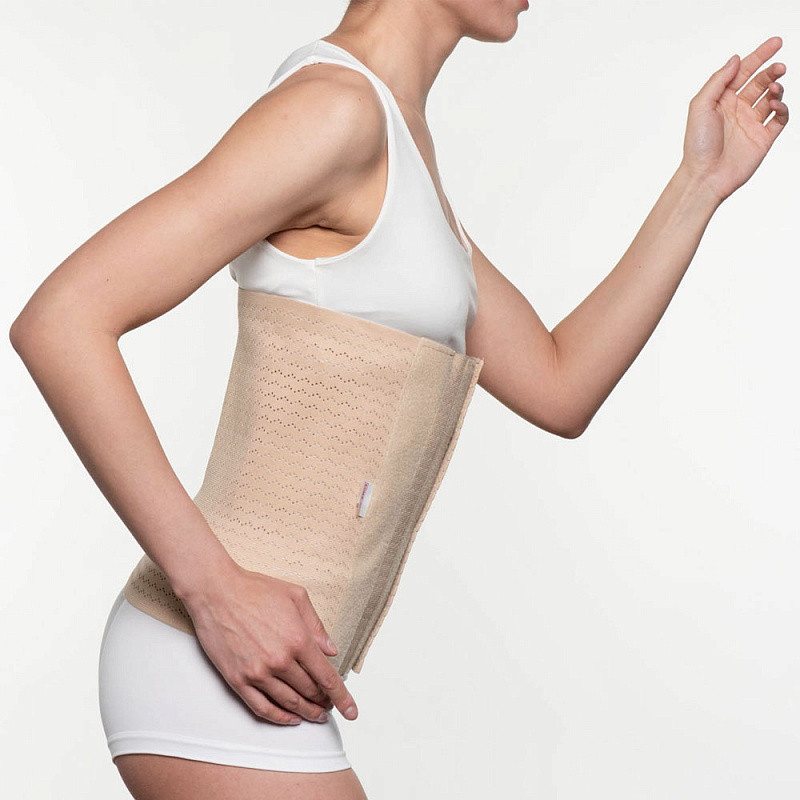 Бандаж выполнен из медицинского эластика, снабжен специальной застежкой «велкро». Обеспечивает фиксацию послеоперационного шва после операций на органах брюшной полости. Поддерживает переднюю брюшную стенку, а также поясничную область. Может использоваться для фиксации нижнегрудного отдела у женщин и грудного отдела у мужчин. Изделие эластичное и анатомично располагается на теле. Практически не виден под одеждой. Высоту пояса выбирают в зависимости от длины послеоперационной раны и роста человека. При использовании изделия в раннем послеоперационном периоде позволяет уменьшить болевой синдром, ускорить заживление раны и позволяет раньше активизировать пациента.br /