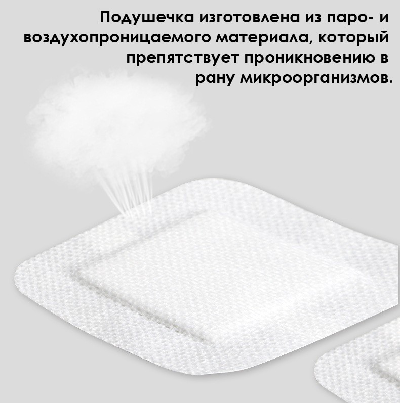 Подушечка изготовлена из паро- и воздухопроницаемого материала, который препятствует проникновению в рану микроорганизмов.