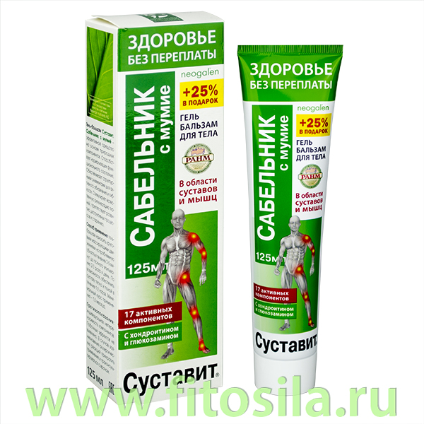 Суставит (сабельник/мумие) гель-бальзам - эффективное натуральное средство профилактики заболеваний суставов и позвоночника. Создан на основе уникального природного минерала бишофит, хондропротек-тора глюкозамин и экстрактов лекарственных растений. Способствует естественной регенерации суставных тканей, препятствует развитию дистрофических процессов и преждевременному старению суставов.