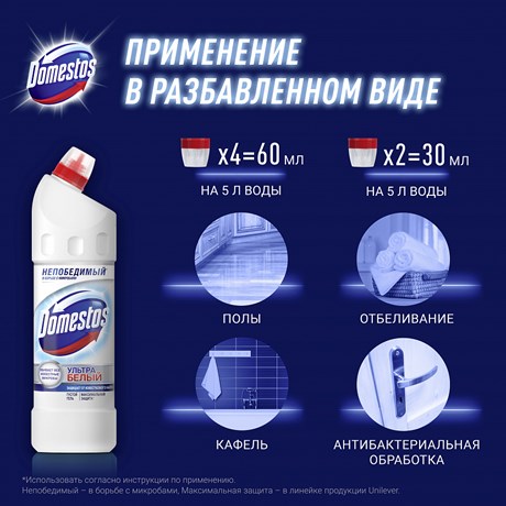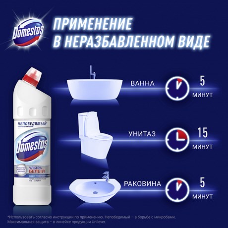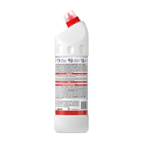Domestos – признанный эксперт' в заботе о чистоте туалета и ванной комнаты. Чистящее средство для унитаза Domestos Ультра белый поможет легко и быстро привести в порядок ваш туалет и уничтожить микробы для защиты всей вашей семьи. Инновационный изогнутый дозатор обеспечивает максимальную зону поражения микробов благодаря носику, который до 3 раз эффективнее'' в труднодоступных местах и под ободком унитаза. Благодаря особой густой формуле с дезинфицирующим эффектом и чистящими компонентами Domestos Ультра белый не только очищает, но и превосходно отбеливает фаянсовые поверхности. Ваша сантехника засияет белоснежной чистотой. Кроме того, Domestos Ультра Белый экономичен – благодаря густой гелевой текстуре он расходуется намного дольше, чем обычные жидкие средства. Ультра белый многофункционален: он подходит не только для чистоты и гигиены унитаза, но и для удаления плесени, мыльного осадка, антимикробной обработки малых поверхностей и предотвращения известкового налета. Domestos Ультра Белый гель обеспечивает эффективное очищение, уничтожение всех известных микробов (включая бактерии, грибок и вирусы)''', обеспечивая настоящую гигиену дома и, как результат, способствует предотвращению распространение различных вирусных и бактериальных инфекций.