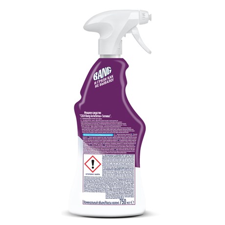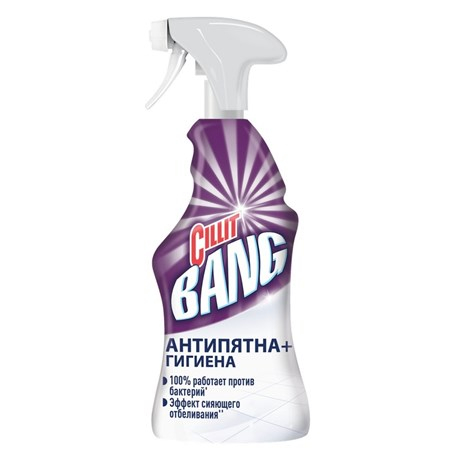 Чистящее средство Cillit Bang Антипятна + Гигиена эффективно устраняет бактерии и побеждает пятна различного происхождения. Идеально подходит для уборки ежедневных или застарелых пятен, в том числе для различных материалов и поверхностей, таких как раковины, ванны, душевые кабины, рабочие поверхности на кухне и др. Эргономичный флакон оснащен высоконадежным курковым распылителем, позволяющим легко и экономично наносить раствор на загрязненную поверхность. Применение: наденьте защитные перчатки. Распылите средство, держа бутылку прямо на расстоянии минимум 10-15 см от поверхности. Оставьте средство на поверхности до 15 минут. Потрите поверхность губкой/тряпкой. Тщательно смойте водой. Перед использованием всегда пробуйте средство на менее заметном участке в течение 3 минут. Bang и плесени как не бывало!