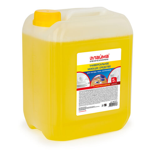 Универсальное моющее средство LAIMA PROFESSIONAL предназначено для мытья и обезжиривания различных твердых поверхностей: посуды, поверхностей бытового и производственного оборудования, стен и полов. Также возможно применение на поверхностях из линолеума, камня, металла, стекла, керамики, фаянса, ПВХ. Средство объемом 5 л разрешено для применения в быту, кафе, ресторанах, комбинатах общественного питания, лечебно-профилактических, учебных и детских учреждениях. Специальная формула позволяет эффективно растворять и эмульгировать масла и жиры растительного и животного происхождения, очищать поверхности от комбинированных застарелых загрязнений. Средство работает в воде любой жесткости и температуры. Нетоксично, полностью безопасно при использовании по назначению. Способ применения: Развести 60 мл средства (две крышки) на 5 л воды и вымыть загрязненную поверхность (посуда, пол, кафель, сантехника), затем смыть водой.