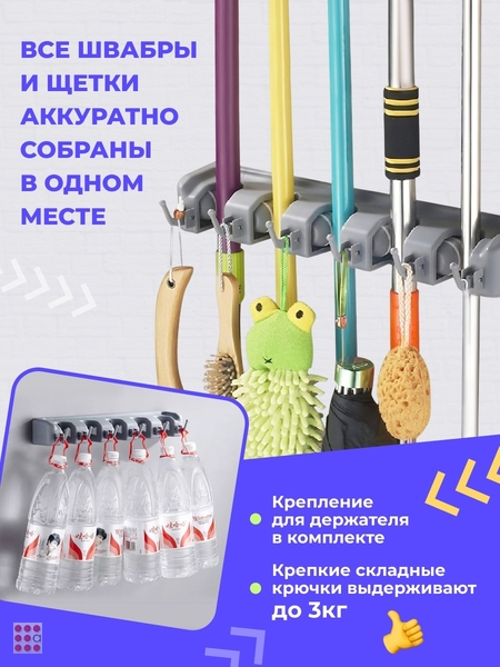 Держатель для швабры с крючками складывающегося типа (6 крючков), что позволяет комфортно хранить еще и салфетки для уборки, одежду, губки и другие аксессуары для уборки.