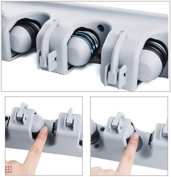 Регулируемые резиновые ролики надежно фиксируют ручки инвентаря. Универсальный держатель поможет скорректировать небольшое пространство ванной комнаты, кухни, садовой постройки, прачечной или другого помещения, очень практичное использование любого пространства.