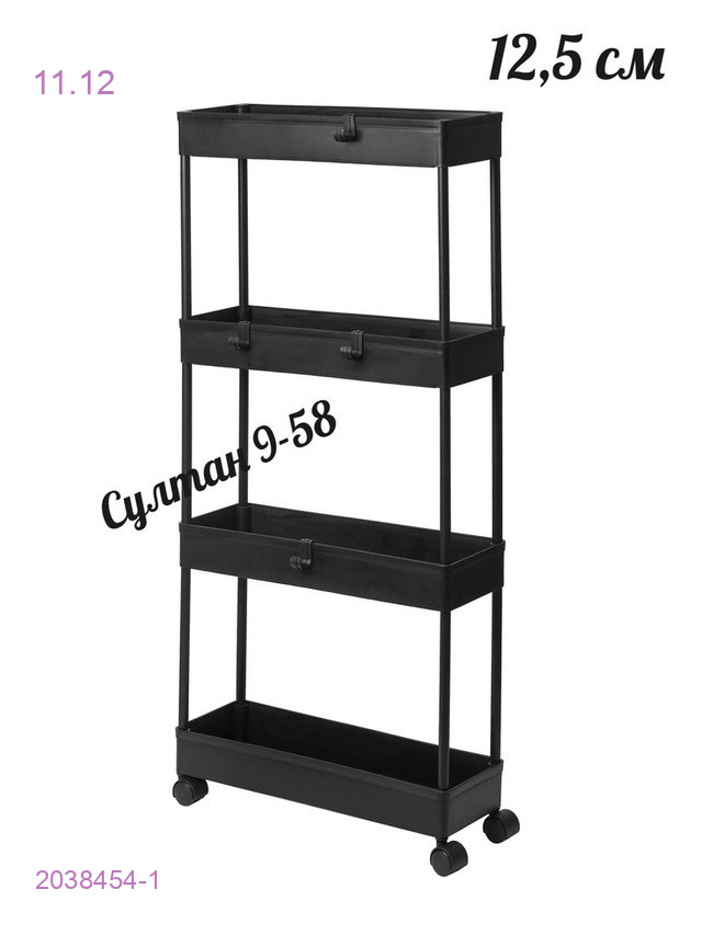 Цвет: черныйПластик..показатьовая этажерка на колесиках 4 яруса (узкая) размер: высота 80, ширина 39, глубина 12,5 см цвет: черныйовая этажерка на колесиках 4 яруса (узкая)
