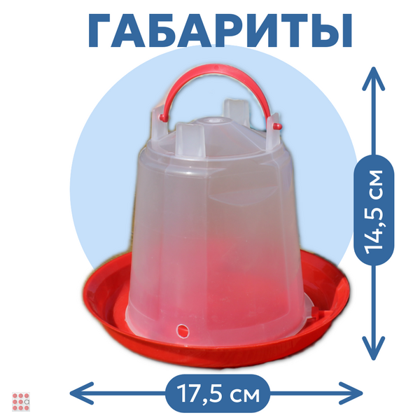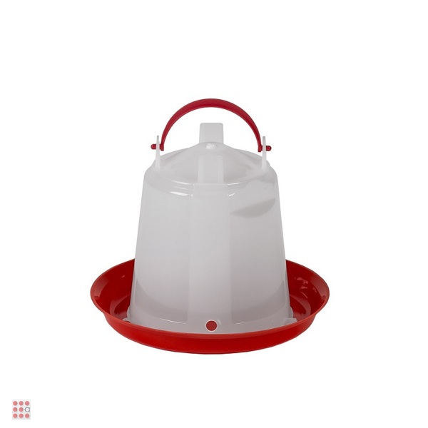Поилка изготовлена из пластика, состоит из бачка-конуса и крышки-дна. Вода заливается в бачек,плотно закрывается крышкой и перевернув ставится на нее. Подходит для цыплят и взрослой птицы. Объем:1 л