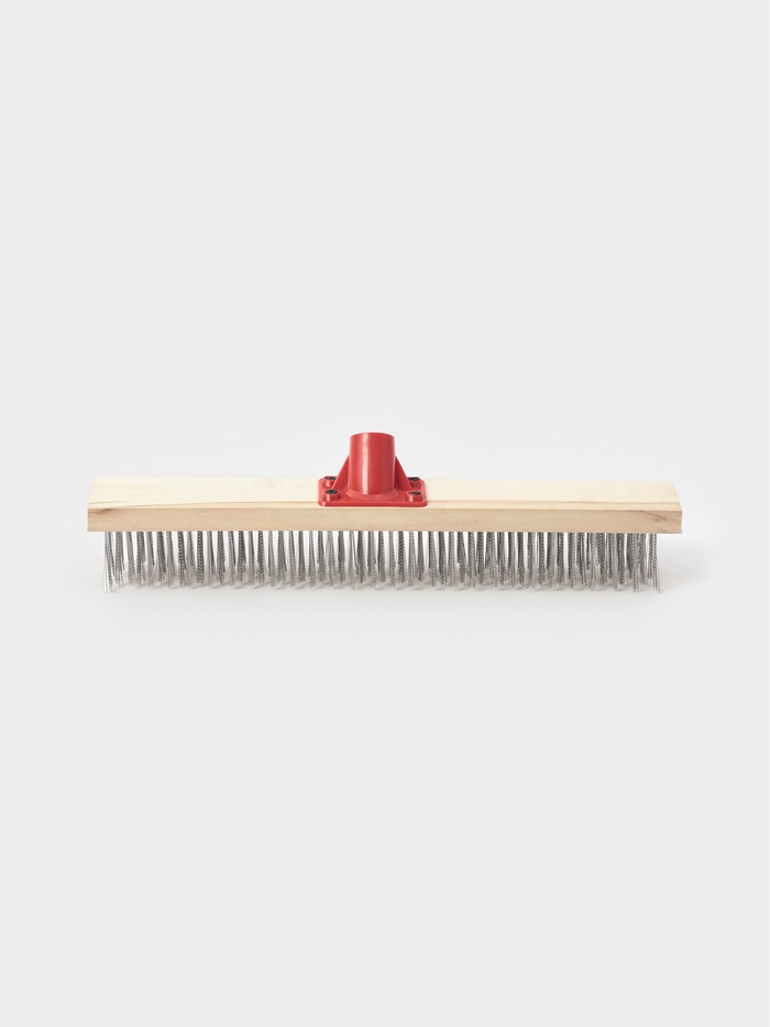 Металлическая щетина работает там, где пластик и синтетика бессильны. Эта щётка шириной 40 см создана для грубой уборки — засохший раствор, старая краска, намертво прикипевшая грязь на бетоне или плитке поддаются только стальному ворсу. Деревянная колодка лежит в руке плотно и не скользит даже в мокрых перчатках.