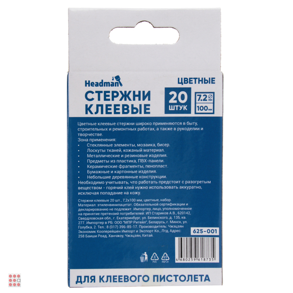 Клеевые стержни HEADMAN для клеевого пистолета. Подходят, чтобы склеивать небольшие деревянные конструкции, бумагу, картон, керамику, пенопласт, пластик, ПВХ, металлические и резиновые изделия, ткань, кожу, бисер, стекло. Клеевые стержни используют при ремонтных и строительных работах, для рукоделия и поделок. В наборе 20 стержней: белые, красные, зеленые, синие и желтые. Подбирайте под цвет деталей, которые нужно склеить. Набор в блистерной упаковке, которая защищает стержни при транспортировке, чтобы они не поломались. Диаметр стержней 7,2мм, длина 100 мм.