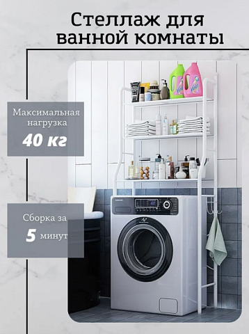 Практичный и функциональный белый стеллаж для ванной комнаты для экономии места и компактного хранения принадлежностей в ванной комнате, на кухне, на даче, в кладовке, на балконе. Универсальная конструкция позволяет расположить полку, как над стиральной машиной, так и над унитазом.