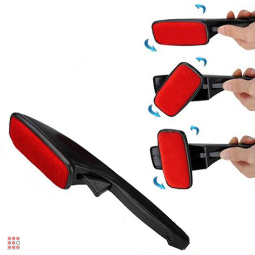 Щетка для удаления пыли, волос и шерсти животных с одежды с поворотным механизмом красного цвета с длинной черной ручкой.Велюровая щетка для чистки одежды, мягкой мебели, сидений автомобиля, и других текстильных изделий
