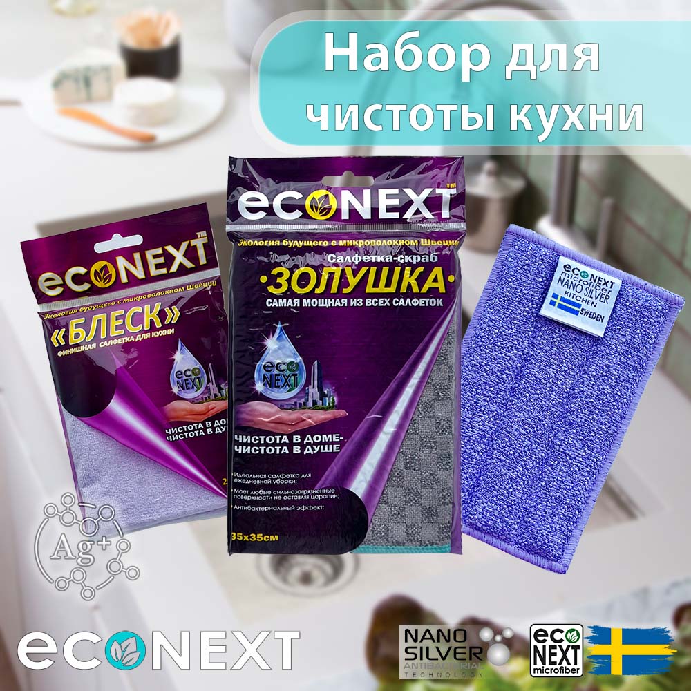 Комплект салфеток для чистоты кухни салфетка "Блеск", Спонж "Кардинал", Салфетка "Золушка" EcoNext
