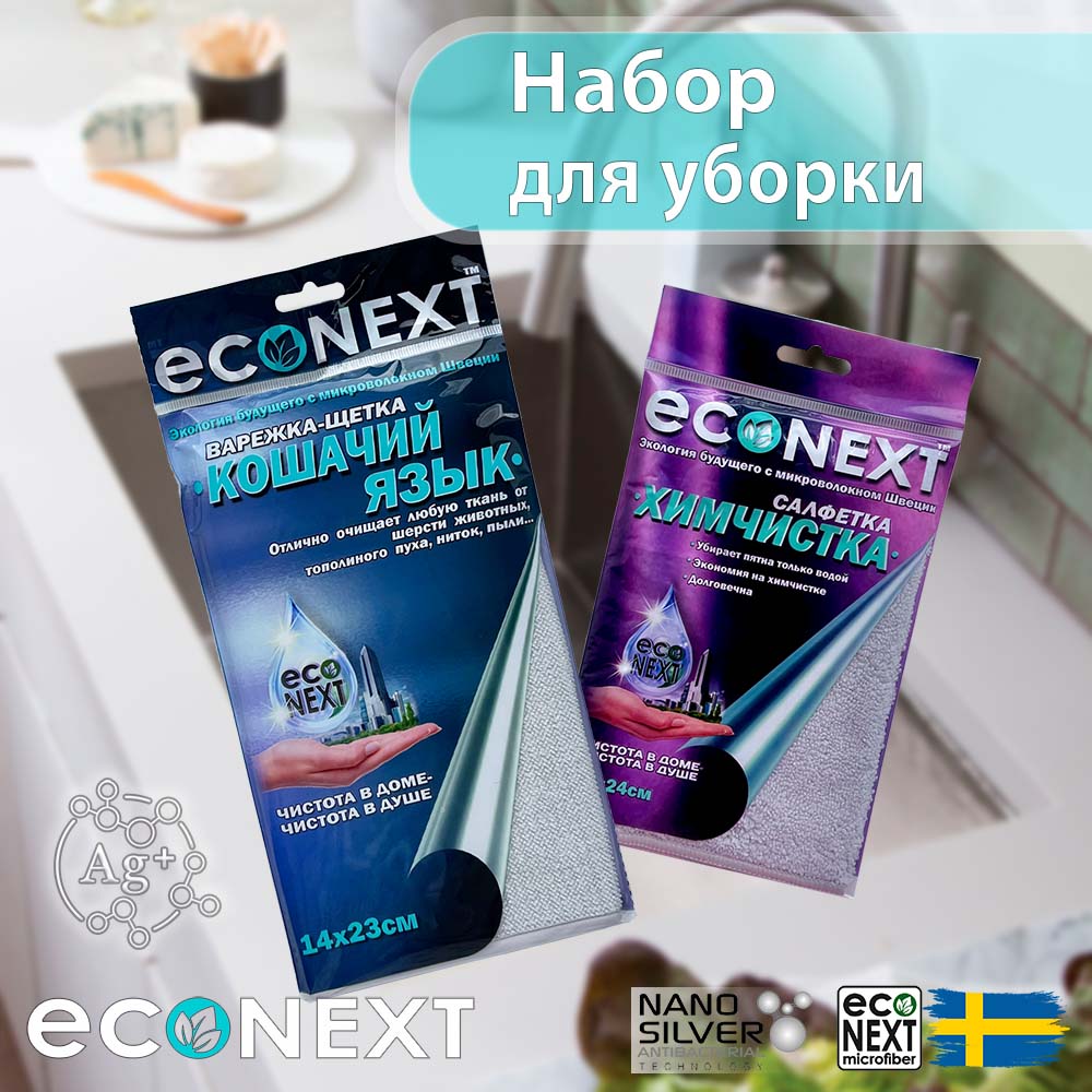 Комплект салфеток для уборки варежка "Кошачий язык", салфетка "Химчистка" EcoNext