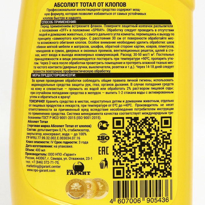 Профессиональная разработка в форме готового раствора для самостоятельного применения в быту. Предназначен для уничтожения тараканов, муравьев, клопов, блох, крысиных клещей, мух, комаров, ос. Средство наносится на поверхности в местах скопления и передвижения насекомых при помощи удобной системы куркового распыления. Содержит специальный компонент, усиливающий действие столь малой концентрации АДВ.Действующее веществодельтаметрин 0,1%Способ примененияСредство наносится на поверхности в местах скопления и передвижения насекомых при помощи крышки-распылителя.