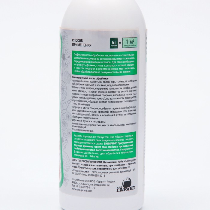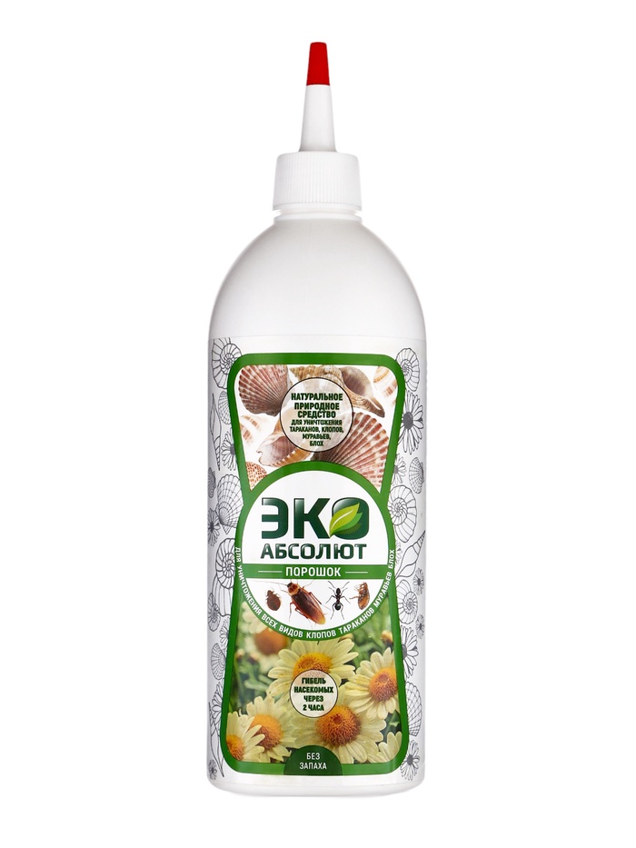 ЭКО АБСОЛЮТ порошок - современное уникальное природное средство, предназначенное для уничтожения тараканов, муравьев, блох, клопов, чешуйниц, сверчков, пауков, мокриц, двухвосток и других ползающих насекомых в помещениях и на открытых территориях. Средство готово к применению, не имеет запаха, безопасно для людей, животных и растений. Кроме применения в качестве инсектицида, ЭКО АБСОЛЮТ порошок может быть использован для борьбы с плесенью и повышенной влажностью в погребах, складах, овощехранилищах и подкормки домашних и садовых растений.Действующее веществодиатомит 95%пиретрум 5%Способ применения:Тщательно обсыпать порошком места обитания, скопления и передвижения насекомых из расчета 5 г порошка на 1 м. кв.