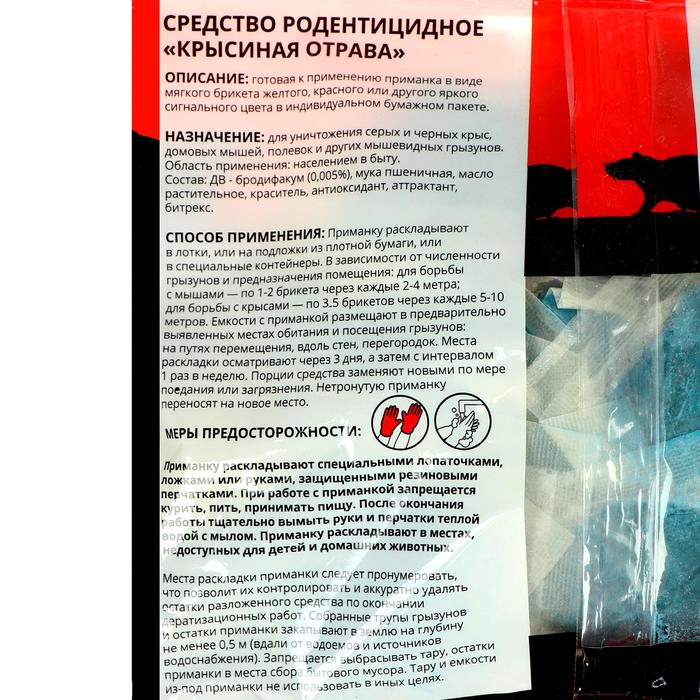 Брикет имеет мягкую текстуру, что позволяет крысам легко его проглотить, а специально разработанная формула является быстродействующей и гарантирует успешное уничтожение грызунов.