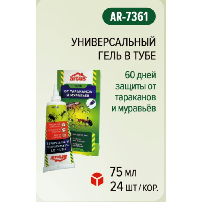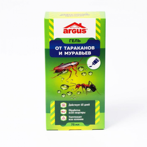 Универсальный гель от тараканов и муравьев.Способ применения: cнять защитный колпачок, нанести гель в места скопления или возможного перемещения насекомых каплями на расстоянии 20-50 см. друг от друга, в местах обитания или перемещения насекомых (вдоль плинтусов, в щели, трещины, под батареями, мойкой, за холодильником, шкафами, полками, около труб горячего водоснабжения и т.д.). При высокой численности насекомых расстояние между капельками геля следует сократить. Гель также можно нанести на поверхность листочка бумаги и разместить его на обрабатываемой площади. После использования закрыть тубу со средством защитным колпачком.Эффективность: гибель насекомых наступает на 2 – 3 сутки. Одной тубы с гелем достаточно для обработки помещения примерно площадью 90 м2.Рекомендации: при появлении насекомых следует произвести повторную обработку, но не ранее, чем через один месяц, т.к. гель обладает длительным кишечно-контактным действием, сохраняет свои свойства до 2 месяцев. Во избежание случайного приема внутрь людьми или животными гель содержит горькую добавку «битрекс».Срок годности: 36 месяцев.Состав: лямбда-цигалотрин 0,1%, консервант, вкусо-ароматические добавки и другие функциональные компоненты.