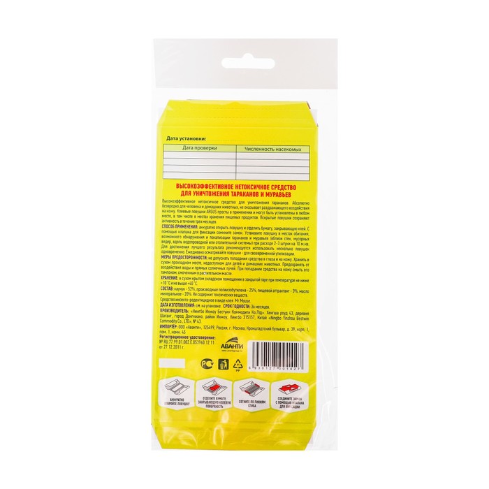 Клеевые ловушки от тараканов являются эффективным средством борьбы с этими насекомыми в домашних условиях. Одним из наиболее популярных продуктов на рынке является клеевая ловушка "ARGUS"Меры предосторожности• Перед использованием клеевой ловушки "ARGUS" необходимо ознакомиться с мерами предосторожности, чтобы избежать неприятных последствий. Во-первых, следует избегать контакта с клеем, так как он может вызвать раздражение кожи. Если вы случайно прикоснулись к клею, немедленно промойте зону контакта водой и обратитесь к врачу, если возникла реакция кожи.• Следует устанавливать ловушки в местах, недоступных для детей и домашних животных. Клеевая ловушка "ARGUS" не является ядовитым продуктом, но ее употребление может вызвать неприятные последствия для здоровья.Способ примененияОткройте упаковку и аккуратно отделите бумагу, закрывающую клей.С помощью клапана для фиксации сомкните замок.Установите ловушку вблизи стен или других мест, где вы заметили тараканов.Для достижения лучшего результата рекомендуется использовать несколько ловушек одновременно. Расположите их в разных местах комнаты.Ежедневно осматривайте ловушки, чтобы своевременно утилизировать захваченных тараканов. СОСТАВ: Каучук - 52%, производные полиизобутилена - 25%, пищевой аттрактант - 3%, масло минеральное - 20%.