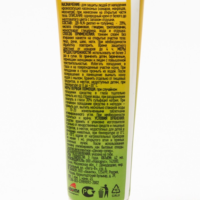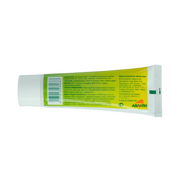 ОписаниеСредство обеспечивает надежную защиту от укусов комаров и мошек в течении 2 часов.Способ примененияРавномерно, тонким слоем без втирания нанести крем на открытые участки тела. При необходимости повторить обработку.Меры предосторожности:Использовать не более 3-х раз в сутки, избегать попадание в глаза, на губы и на поврежденные участки кожи. В случае попадания - промыть водой. После использования вымыть кожу водой с мылом. Действующее вещество: N,N - диэтилт-м-толуамид (ДЭТА) - 3%, натуральная кремовая основа.