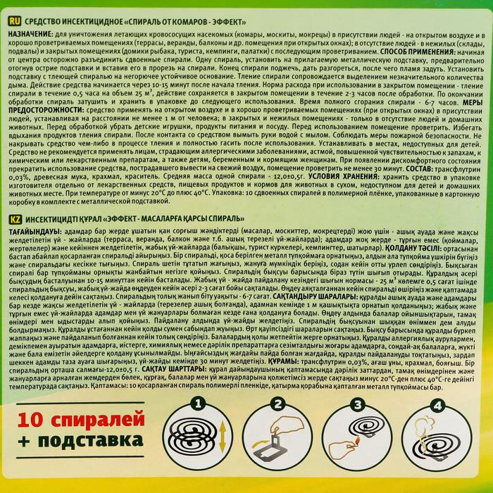 ОписаниеСпирали малодымные от комаров ARGUS предназначены для уничтожения комаров и других летающих насекомых (мошки, мокрецы, москиты) на открытом воздухе (сад, приусадебный участок, беседка, открытая терраса, веранда) в присутствии взрослых людей, а так же в закрытых помещениях в отсутствии людей.Тление спирали сопровождается выделением незначительного количества дыма. Резерв спирали весом в 13г - 7 часов. Гибель комаров в помещении начинается через 1-2 минуты и достигает 100% через 10-15 минут.Способ примененияВскрыть упаковку, достать спираль, поместить ее на прилагаемую металлическую подставку или на невоспламеняющуюся поверхность (металлическая крышка, блюдце, пепельница), поджечь, пламя задуть и оставить дымить до достижения нужного эффекта, поместив с подветренной стороны. После полной гибели комаров и других насекомых спираль можно затушить и сохранять для дальнейшего использования. Состав: действующее вещество – d-аллетрин (0,20%), краситель, окислитель, консервант.