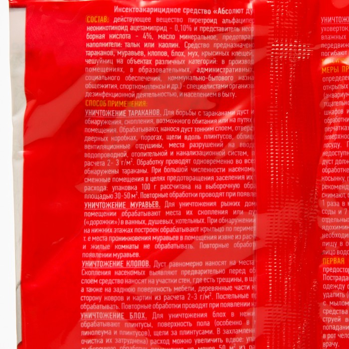 Бдительный страж дуст от тараканов и клопов - универсальное инсектицидное средство предназначен для уничтожения всех видов тараканов, муравьев, клопов, блох, мух. СОСТАВДВ: Фентион - 0,25%; дельтаметрин - 0,02%; отдушка, наполнители до 100%.СПОСОБ ПРИМЕНЕНИЯДля проведения обработки необходимо равномерно распылить средство в местах возможного обитания, скопления и передвижения насекомых.От Клопов - места возможного обитания насекомых (заднюю поверхность ковров, мебели, картин, диванов, кресел, кроватей, щели в плинтусах).От Тараканов - места их скопления и передвижения к пище и воде, плинтусы, стыки кафельных плит, вентиляционные отдушины водопроводные и отопительные трубы, под раковиной и другие возможные места обитания.От Блох - плинтусы и между ними, стены на высоту 1м, щели в полу. Подстилки и коврики для животных обработать с нижней стороны, через день тщательно выбить, а через три дня постирать.От Мух - обработка мест выплода (мусорокамеры, выгребные ямы, емкости для сбора мусора).Содержимого пакеты достаточно для обработки 25-30м2.