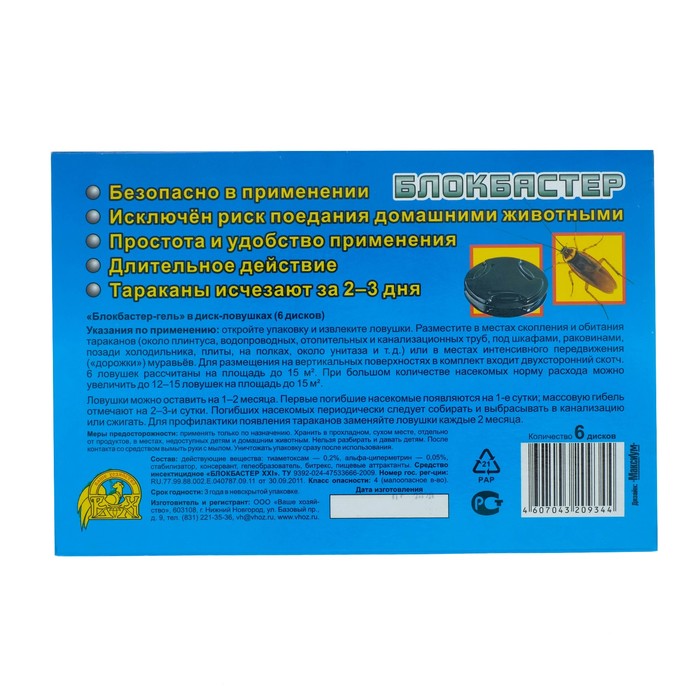 «Блокбастер XXI диск-ловушка» от тараканов. Срок эффективного действия до 60 дней, безопасно в применении, исключён риск поедания домашними животными, простота и удобство применения, длительное действие, тараканы исчезают за 2–3 дня.