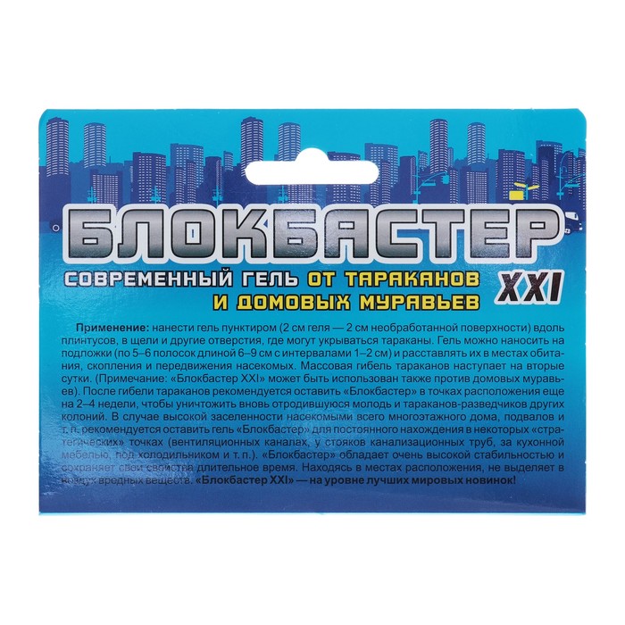 Гель «Блокбастер XXI» бесцветен и не заметен на обрабатываемых поверхностях. Один шприц-дозатор рассчитан на обработку помещений площадью 70–100 м².