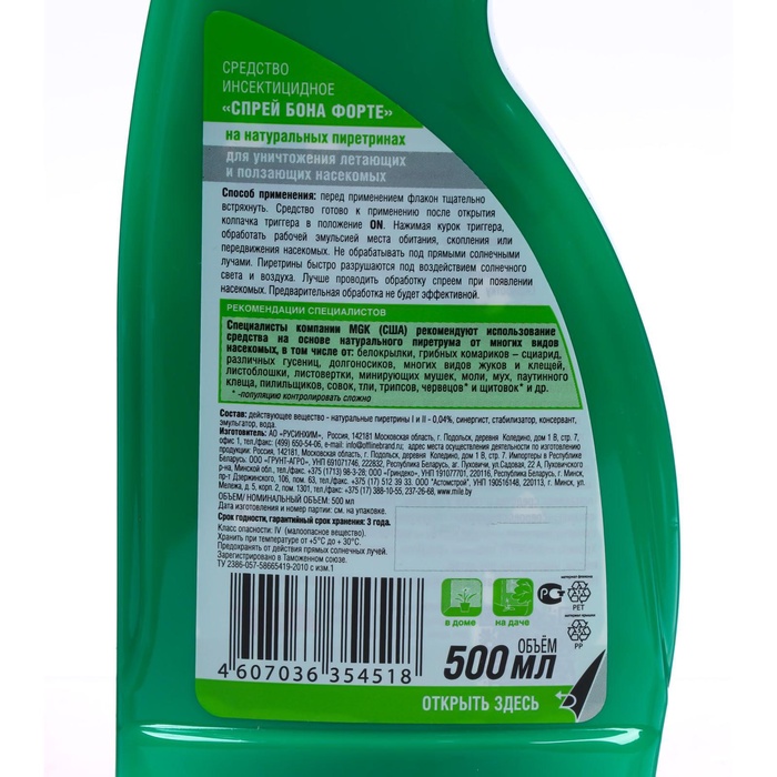 **Спрей от насекомых Бона Форте** - содержит только натуральные ингредиенты и не содержит вредных химических веществ. Средство выпускается в флаконе объемом 500 мл с триггером для удобства использования.**Основным действующим веществом** спрея является пиретрин – натуральный инсектицид, получаемый из цветков пиретрума. Он быстро и эффективно уничтожает насекомых, таких как мухи, комары, клещи, тараканы и другие вредители.• Бона Форте • Имеет приятный запах • Не оставляет на поверхностях следов и пятен• Можно использовать как в помещениях, так и на открытом воздухе • Не вызывает аллергических реакций и не оказывает вредного воздействия на окружающую среду.Средство легко и удобно наносится на поверхности, не требует дополнительных инструментов или знаний. Рекомендуется применять спрей в соответствии с инструкцией на упаковке.Бона Форте – это надежный и безопасный способ защиты от насекомых, который поможет создать комфортные условия проживания и отдыха.